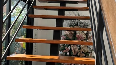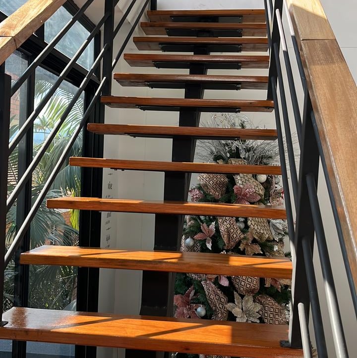 En este proyecto residencial en Viterbo Caldas, nuestro equipo diseñó y construyó una escalera moderna que se convirtiera en el eje visual del hogar. Trabajamos una estructura metálica robusta combinada con peldaños en madera natural, logrando un equilibrio perfecto entre resistencia, elegancia y calidez.